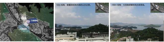 周边多个自然景观环绕,从地块50m高度视角可看到铁岗水库的山水近景,100m高度视角可俯瞰大范围的山水景观,视野感受极佳。